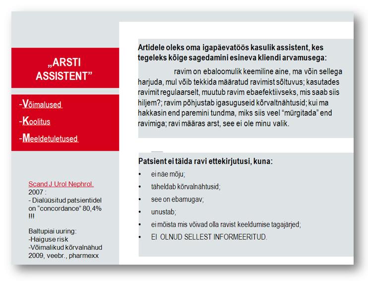 Analüüsides olemasoleva patsiendi haiguse kulgu algusest kuni tugiravi etapini, näete kommunikatsiooni puudujääke punktides, kus on eriti tähtis konkreetne teave: haiguse uurimismeetodite, ravialternatiivide, ravimite mõju ja võimalike kõrvaltoimete, haiguse kulgemise ja võimalike tüsistuste jne. kohta.